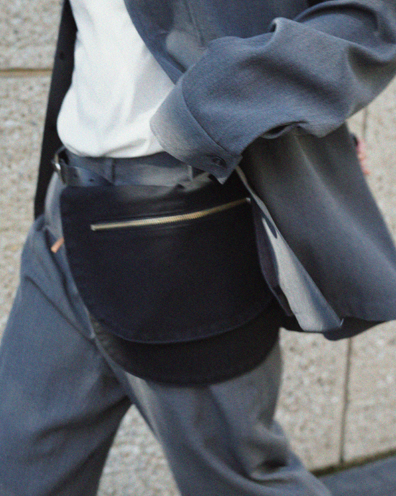 素材とフォルムのコントラストが、腰まわりを静かに主張させる。